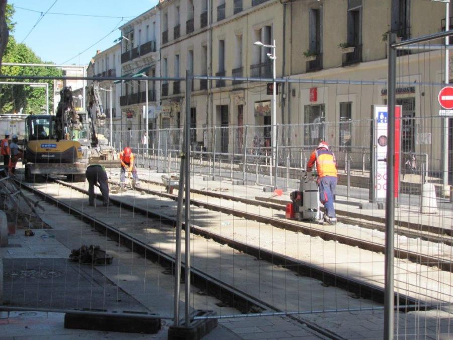 Chantier de réfection du revêtement de la plateforme commune aux lignes 1 et 4 de tramway, boulevard Louis-Blanc à Montpellier, le mardi 7 juillet 2020. Copyright : Edouard Paris