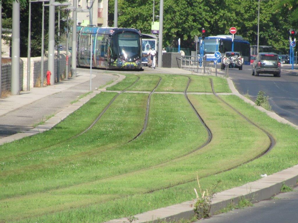 Avenue de Lodève à Montpellier, aperçu d’une partie de la plateforme engazonnée de la ligne 3 de tramway entre les stations « Jules Guesde » et « Tonnelles », le samedi 8 août 2020. Copyright : Edouard Paris