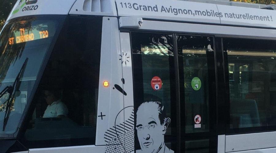 Exemple avignonnais où l’autocollant « Port du masque obligatoire » est appliqué sur l’ensemble des portes à double vantail des rames Citadis 205 Alstom depuis le lundi 11 mai 2020. Photo prise le vendredi 19 juin 2020. Copyright : En passant par là