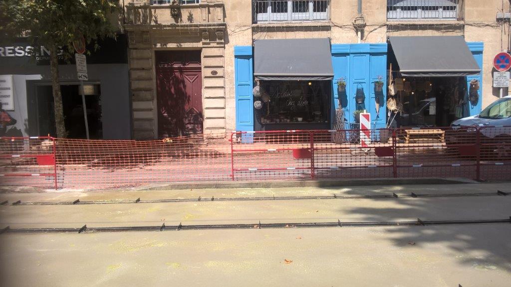 Boulevard Louis-Blanc à Montpellier, au premier plan du béton désactivé frais coulé sur la plateforme du tronc commun des lignes 1 et 4 de tramway, le vendredi 24 juillet 2020. Copyright : Edouard Paris
