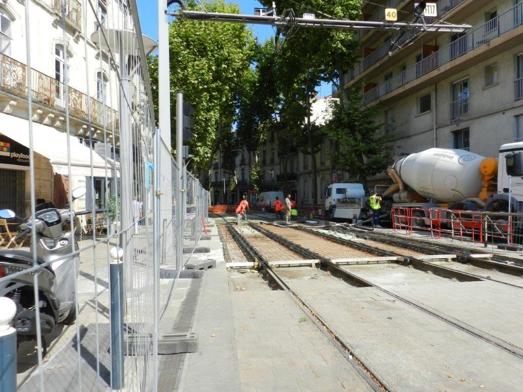 Boulevard Louis-Blanc, tronc commun des lignes 1 et 4 de tramway, coulage du béton désactivé livré par un camion toupie, le jeudi 23 juillet 2020. Copyright : Anje34