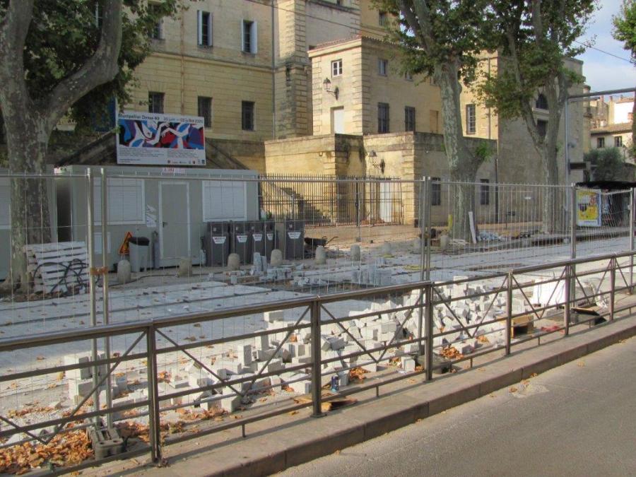Boulevard Louis-Blanc à Montpellier, à la hauteur de la Cité internationale de la danse, il reste encore des pavés en béton à poser sur la plateforme commune aux lignes 1 et 4 de tramway. Photo prise le samedi 8 août 2020. Copyright : Edouard Paris