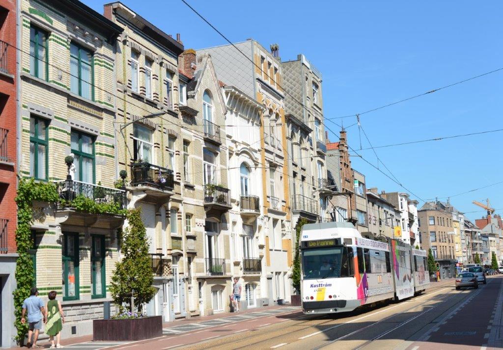 Sur la ligne de tramway de la côte belge, la rame 6005 LRV La Brugeoise et Nivelles revêtue d’une livrée publicitaire, circulant en direction de La Panne, est photographiée dans Blankenberge entre les stations « Blankenberge Gare » et « Blankenberge Marché », le mardi 23 juin 2020. Copyright : Thierry Leleu