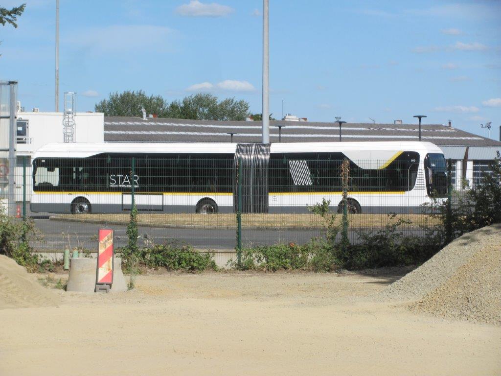 Photographie de l’entier côté gauche du premier exemplaire du bus articulé 100 % électrique Bluebus 18E Bolloré numéroté 500 dans l’enceinte du dépôt STAR de la plaine de Baud à Rennes, le samedi 11 juillet 2020. Copyright : Edouard Paris