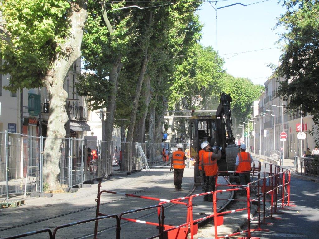 Chantier de pose de bordures de part et d’autre de la plateforme du tramway commune aux lignes 1 et 4 de tramway, boulevard Louis-Blanc à Montpellier, le mardi 7 juillet 2020. Copyright Edouard Paris