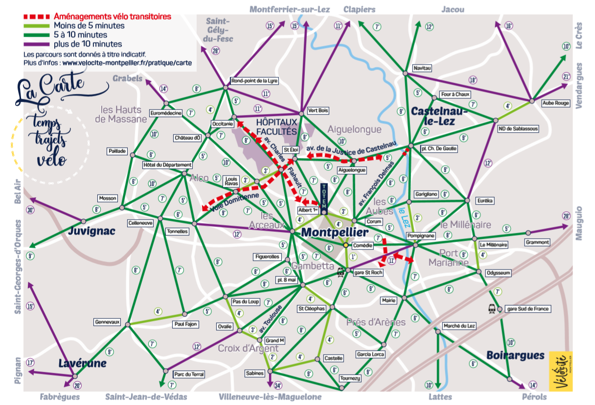 Capture d’écran en date du jeudi 2 juillet 2020 de la carte des temps de trajet à vélo mise en ligne par l’association Vélocité Grand Montpellier, le lundi 11 mai 2020, premier jour de la phase 1 de déconfinement liée à la pandémie de coronavirus Covid-19