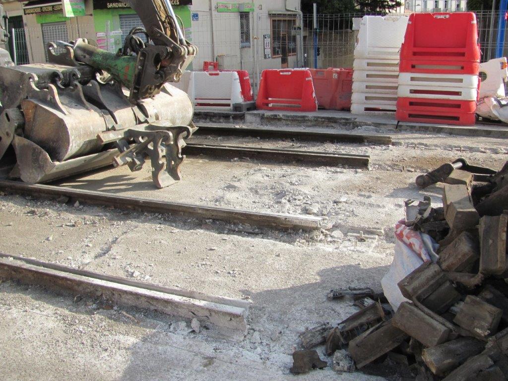 Dans le haut de la rue du Faubourg-de-Nîmes à Montpellier, aperçu de la limite entre les rails à gorge des voies 1 et 2 du tronc commun des lignes 1 et 4 de tramway conservés côté boulevard Louis-Blanc et les nouveaux rails à gorge à poser jusqu’à la station « Corum ». Photo prise le dimanche 2 août 2020. Copyright : Edouard Paris