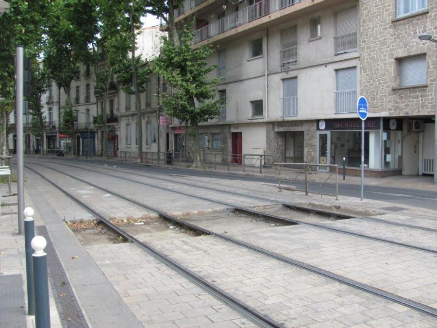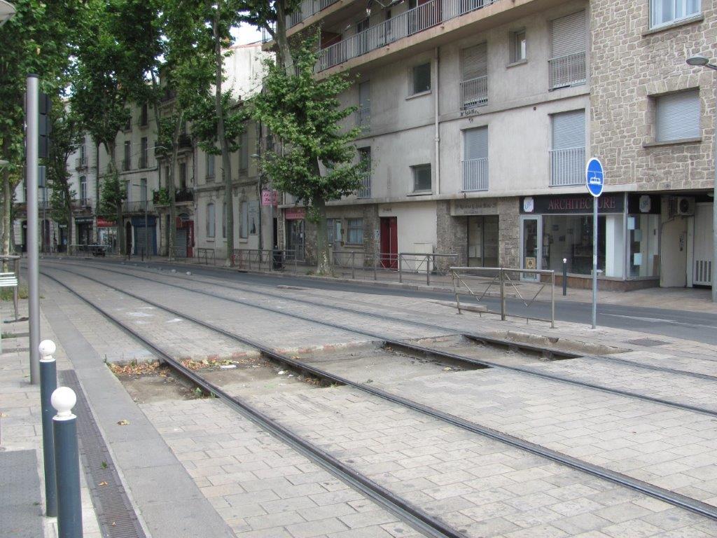 Boulevard Louis-Blanc à Montpellier, dans le courant de l’été 2020, l’actuel revêtement de la plateforme du tronc commun aux lignes 1 et 4 sera remplacé par du béton désactivé. Photo prise le jeudi 2 juillet 2020. Copyright : Edouard Paris