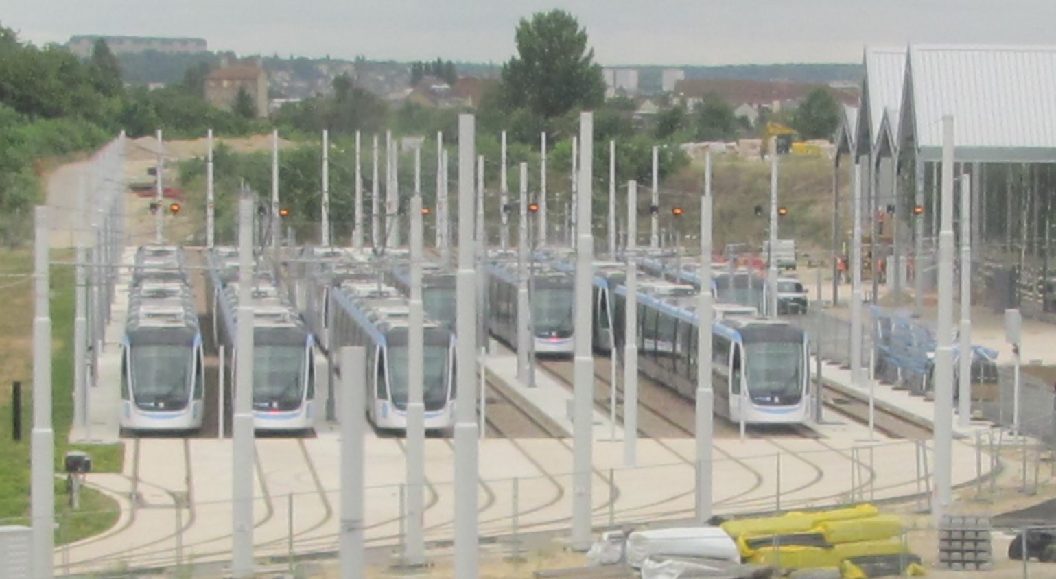 Zone de remisage des rames Citadis 405 Alstom de l’atelier-garage dédié à la future ligne T9 et situé sur la commune d’Orly, photographiée depuis un TGV Rennes – Lyon Perrache, le jeudi 16 juillet 2020. Copyright Edouard Paris