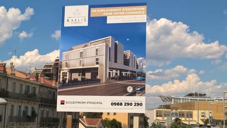 Visuel du nouveau programme immobilier qui pourrait être édifié sur la friche située entre la rue Du Guesclin et l’avenue Henri-Frenay à Montpellier. Sur la droite de ce visuel, on peut distinguer la face avant d’une rame moscovite modèle 71-931 « Vityaz-M » PK Transportnye Sistemy et Metrowagonmash. Photo prise le vendredi 24 juillet 2020. Copyright : Edouard Paris