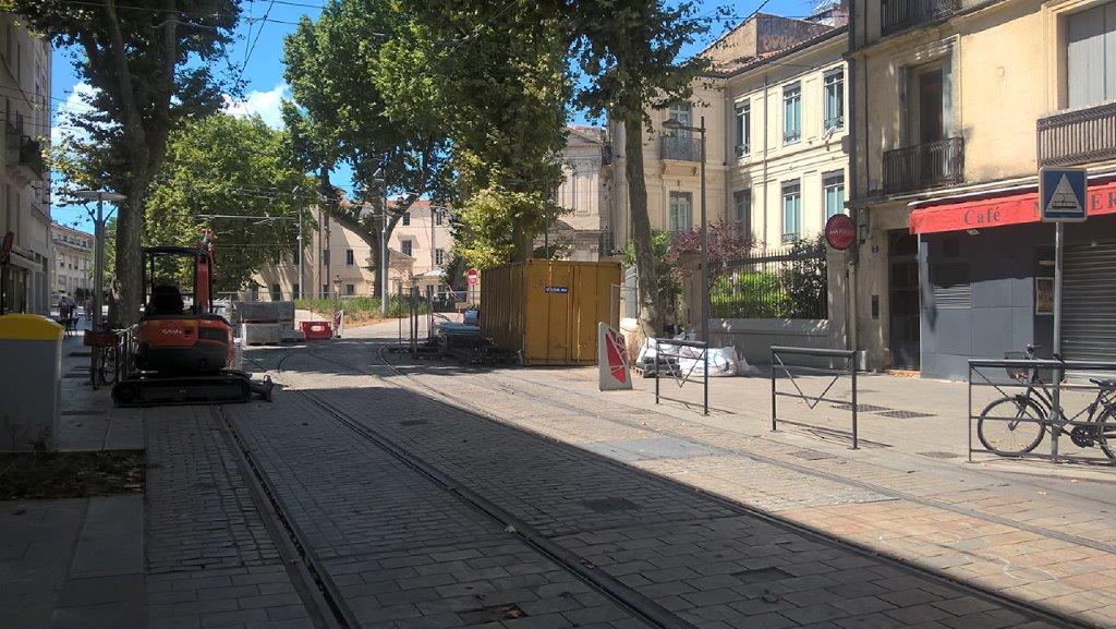 Limite de chantier des travaux d’été 2020 entre le boulevard Pasteur et la place Albert-1er à Montpellier photographiée le vendredi 24 juillet 2020. Copyright : Edouard Paris