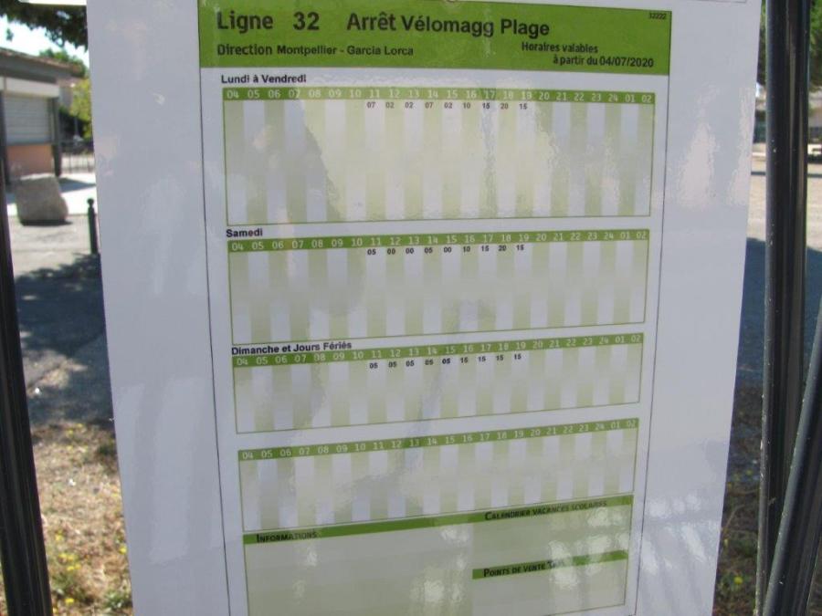 Horaires consultables à l’arrêt « Vélomagg Plage » de la ligne 32 de bus suburbaine, direction « Garcia Lorca », boulevard des Moures à Villeneuve-lès-Maguelone, et valables à compter du samedi 4 juillet 2020, date de la photo. Copyright : Edouard Paris