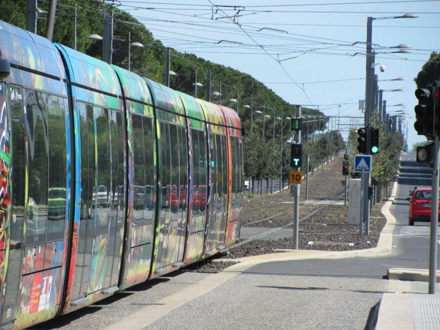 A la bifurcation de Boirargues, direction « Pérols – Etang de l’Or » pour la rame 2076 Citadis 402 Alstom, le samedi 11 avril 2015
