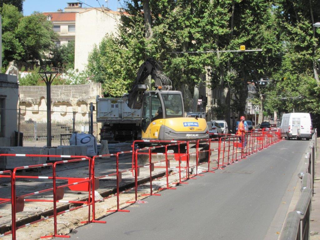 Milieu du boulevard Pasteur à Montpellier, tronc commun des lignes 1 et 4 de tramway, où le nouveau revêtement de la plateforme consistera principalement en du béton désactivé. Photo prise le jeudi 9 juillet 2020. Copyright : Edouard Paris