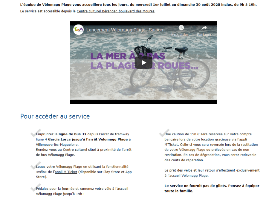 Capture d’écran d’une partie de la page du site TaM Montpellier 3M dédiée au service Vélomagg Plage, où sont précisées les conditions de retrait d’un Vélomagg Plage. Capture d’écran réalisée le samedi 4 juillet 2020