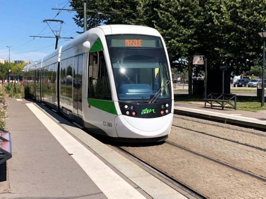 A Nantes, la rame 393 Urbos 3 CAF (année 2013), opérant sur la ligne 1, est photographiée au moment où elle arrive à la station « Gare Maritime » quai directions « Jamet » et « François Mitterrand », le dimanche 12 juillet 2020. Copyright : Fab