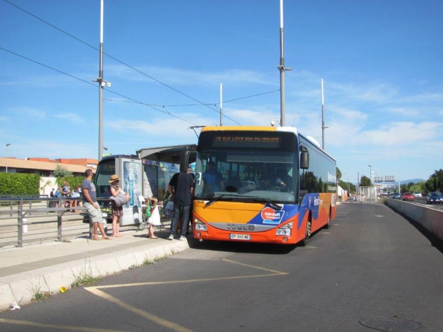 Photographie de la navette des plages de la ligne 633 liO Hérault Transport au terminus « Pérols – Etang de l’Or », le samedi 4 juillet 2020. Copyright : Edouard Paris