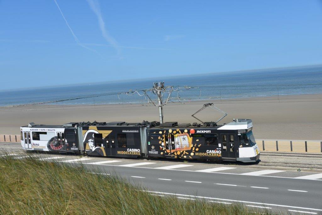 Sur la ligne de tramway de la côte belge, la rame 6009 LRV La Brugeoise et Nivelles au pelliculage intégral Casino de Middelkerke, circulant en direction de Knokke, est photographiée sur la digue longeant la mer du Nord à l’approche de la station « Domein Raversijde » à Ostende, le mardi 23 juin 2020. Copyright : Thierry Leleu