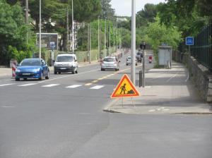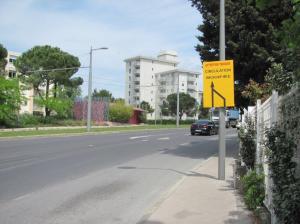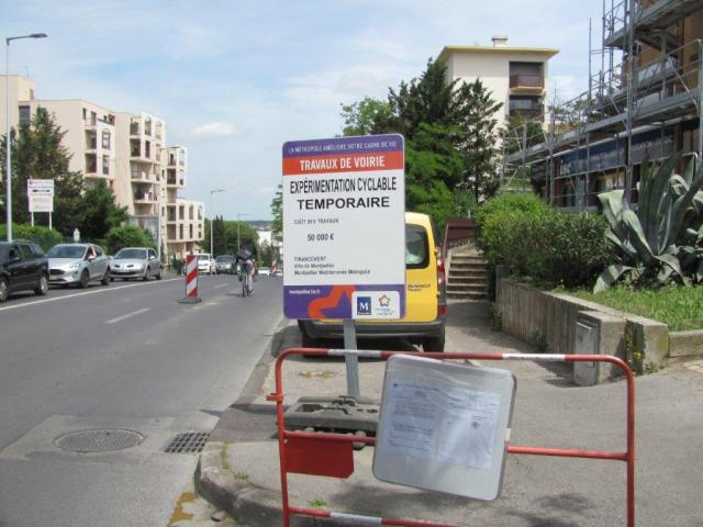 A Montpellier, dans le haut de la rue Marius-Carrieu, photographie d’un panneau annonçant l’expérimentation cyclable temporaire, le mardi 5 mai 2020. Copyright : Edouard Paris