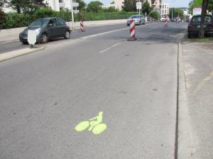 - A Montpellier, pictogramme représentant un cycliste peint sur la chaussée dédiée à la piste cyclable expérimentale temporaire dans le haut de l’avenue Marius-Carrieu. Photo prise le mardi 5 mai 2020. Copyright : Edouard Paris