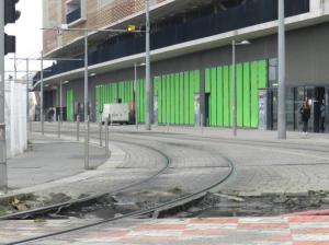 - Le vert est la couleur dominante des élections municipales 2020 à Montpellier. Sur la photo prise le lundi 27 janvier 2020, l’oeuvre baptisée ON/Green de l’artiste Stéphan Barron qui a peint en vert 240 mètres de parois vitrées de locaux du rez-de-chaussée du parking Saint-Roch, qui abriteront prochainement la salle de sport Basic-Fit, rue Alexandra David-Néel où circulent les rames opérant sur les lignes 2 et 4 de tramway. Copyright : Anje34