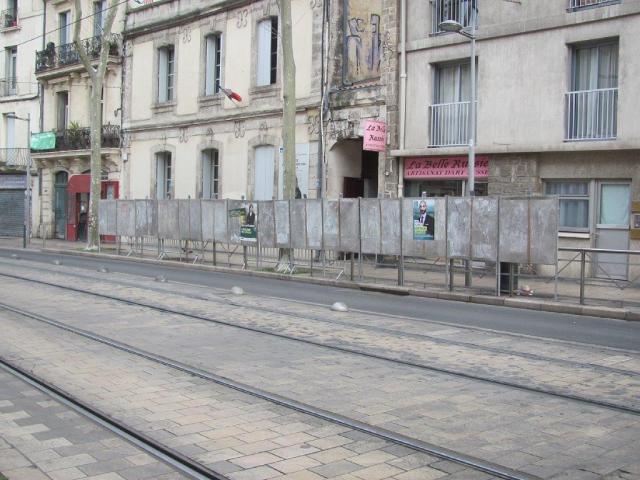 Boulevard Louis-Blanc à Montpellier, à qui s’adressent les panneaux électoraux installés en vue du 1er tour des élections municipales du dimanche 15 mars 2020 ? Aux automobilistes et cyclistes circulant sur ce boulevard à sens et voie uniques, aux passagers voyageant à bord des rames des lignes 1 et 4 de tramway et aux piétons marchant sur le trottoir opposé, mais certainement pas aux personnes qui seront encore hésitantes dans leur choix avant d’entrer dans le bureau de vote de l’Espace Martin-Luther-King. Photo prise le mardi 3 mars 2020. Copyright : Edouard Paris