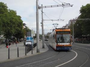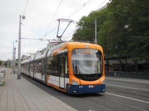 A Gmunden, la rame 121 Tramlink V3 Vossloh Kiepe, circulant en direction de Vorchdorf, est photographiée sur Küferzeile, côté Esplanade, le mardi 1er octobre 2019. Copyright : Edouard Paris