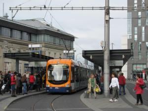 A Gmunden, la rame 130 Tramlink V3 Vossloh Kiepe, circulant en direction du terminus « Gmunden Bahnhof ÖBB », est photographiée à son arrivée à la station « Rathausplatz », le mardi 1er octobre 2019. Copyright : Edouard Paris
