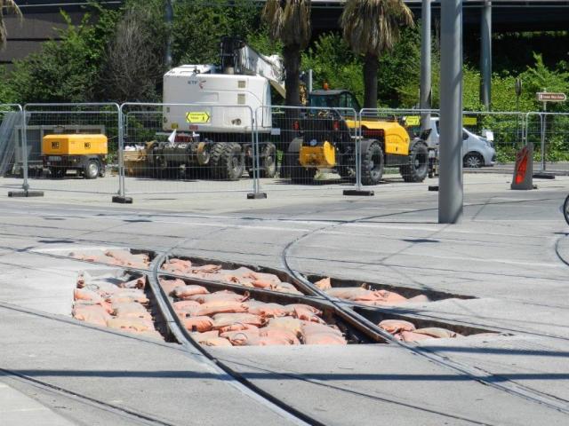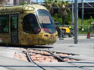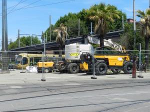 Place du 11 Novembre à Montpellier, carrefour des lignes 1, 2 et 4 de tramway, aux abords de la station « Corum », des travaux de rénovation de la voie ferrée se déroulent en pleine nuit depuis le début de la semaine, entre la fin et le commencement de service des trois lignes précitées.