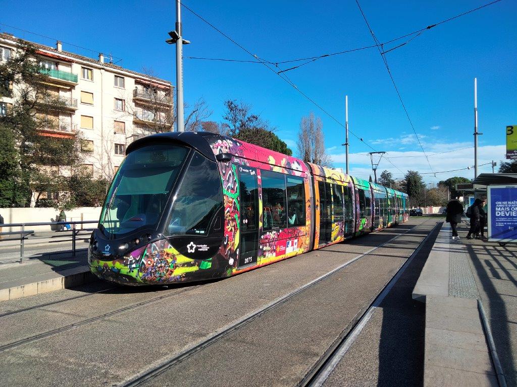 La rame 2075 Citadis 402 Alstom, opérant sur la ligne 3 en direction du terminus intermédiaire « Mosson », est photographiée au moment où elle dessert la station « Tonnelles », le mardi 17 janvier 2023. Copyright : Edouard Paris