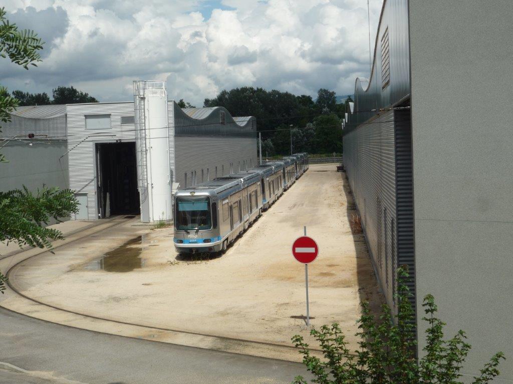 Dans l’enceinte du centre de maintenance des tramways de Gières, aux portes de Grenoble, cinq rames TFS Alsthom étaient dans l’attente de leur sort après 23 ans de service. Fort heureusement pour elles, le Syndicat Mixte des Transports en Commun (SMTC) de l’agglomération grenobloise a, par la suite, privilégié leur rénovation et modernisation à l’achat de nouvelles rames. Photo prise le vendredi 23 juillet 2010. Copyright : Michel Bozzola