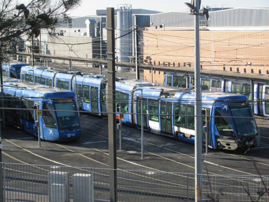 Les deux éléments irrécupérables de la rame 2012 Citadis 401 Alstom ainsi que les trois éléments irrécupérables de la rame 2028 de même type sont garés sur la voie R4 du faisceau extérieur du centre d’exploitation et de maintenance « Les Hirondelles », quartier Mosson à Montpellier. Photo prise le vendredi 8 janvier 2021. Copyright : Edouard Paris