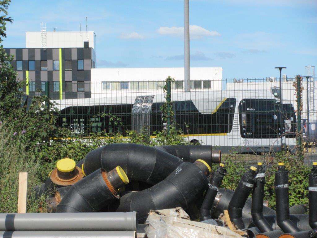 Aperçu de la partie arrière du premier exemplaire du bus articulé 100 % électrique Bluebus 18E Bolloré numéroté 500 dans l’enceinte du dépôt STAR de la plaine de Baud à Rennes, le samedi 11 juillet 2020. Copyright : Edouard Paris