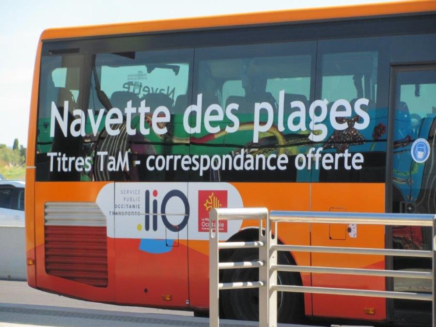 La navette des plages assurée par liO Hérault Transport est accessible avec un titre de transport TaM Montpellier 3M ou un titre de transport liO Hérault Transport, en respectant les règles de correspondance. Le titre de transport dématérialisé M’Ticket TaM est également valable. Photo prise au terminus « Pérols – Etang de l’Or », le samedi 4 juillet 2020. Copyright : Edouard Paris