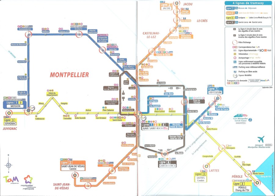 Plan du réseau de tramways publié par TaM Montpellier 3M dans le guide du voyageur édition septembre 2019