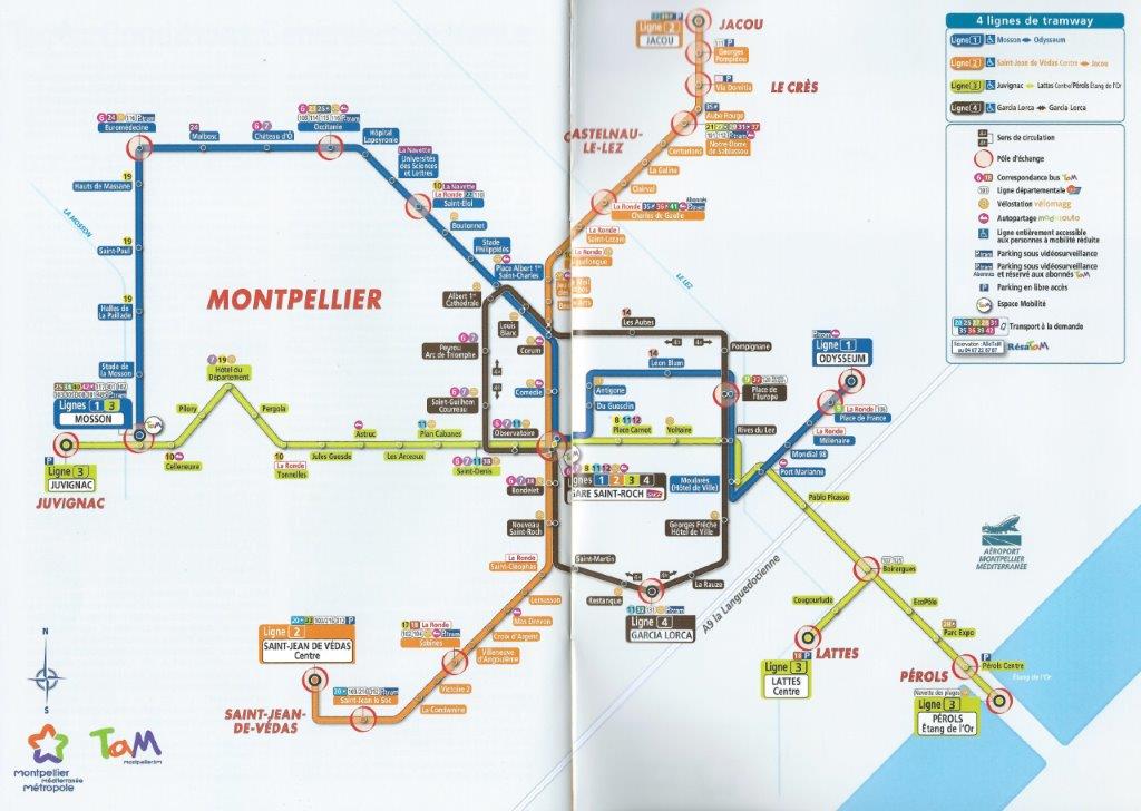 Plan du réseau de tramway figurant en pages 42 et 43 du Guide du Voyageur Août 2017 édité par TaM Montpellier 3M
