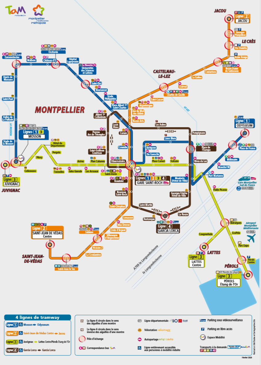 Plan du réseau de tramways disponible sur l’application TaM Montpellier 3M (édition février 2020)
