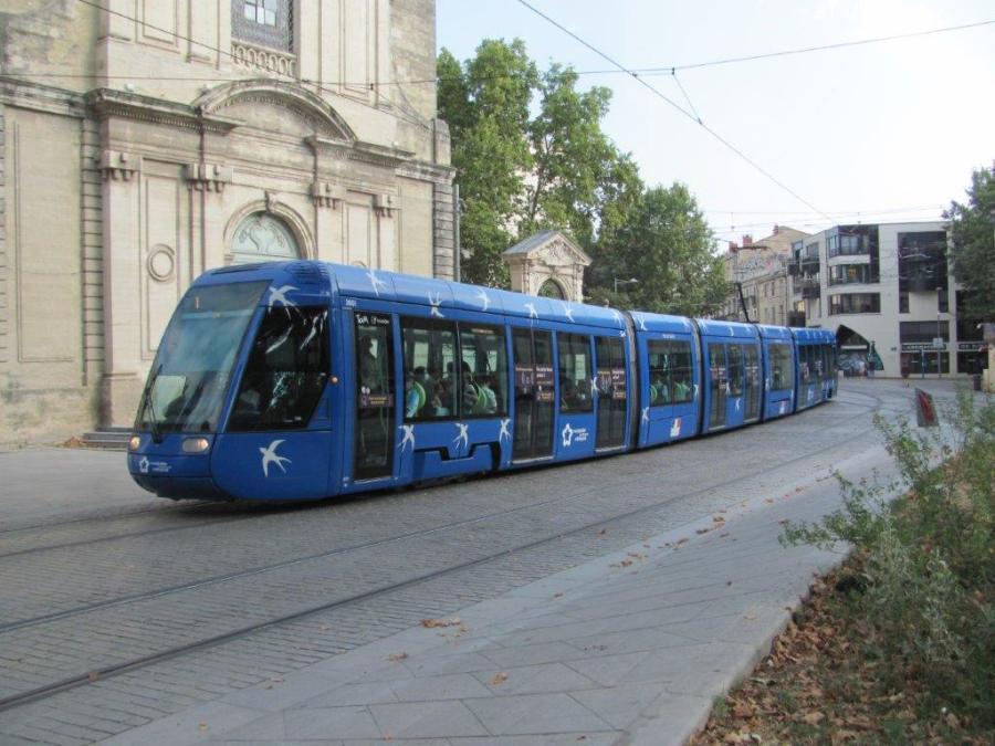 Place Albert-1er à Montpellier, la rame 2001 Citadis 401 Alstom, opérant sur la ligne 1 en direction du terminus « Odysseum », est photographiée entre les stations « Place Albert 1er – Saint-Charles » et « Albert 1er – Cathédrale », le samedi 8 août 2020. Copyright : Edouard Paris