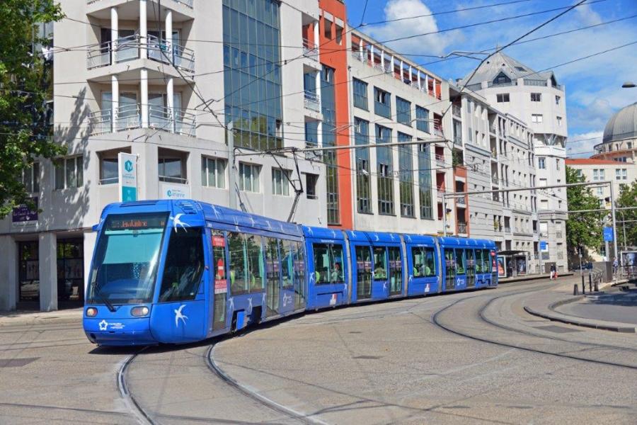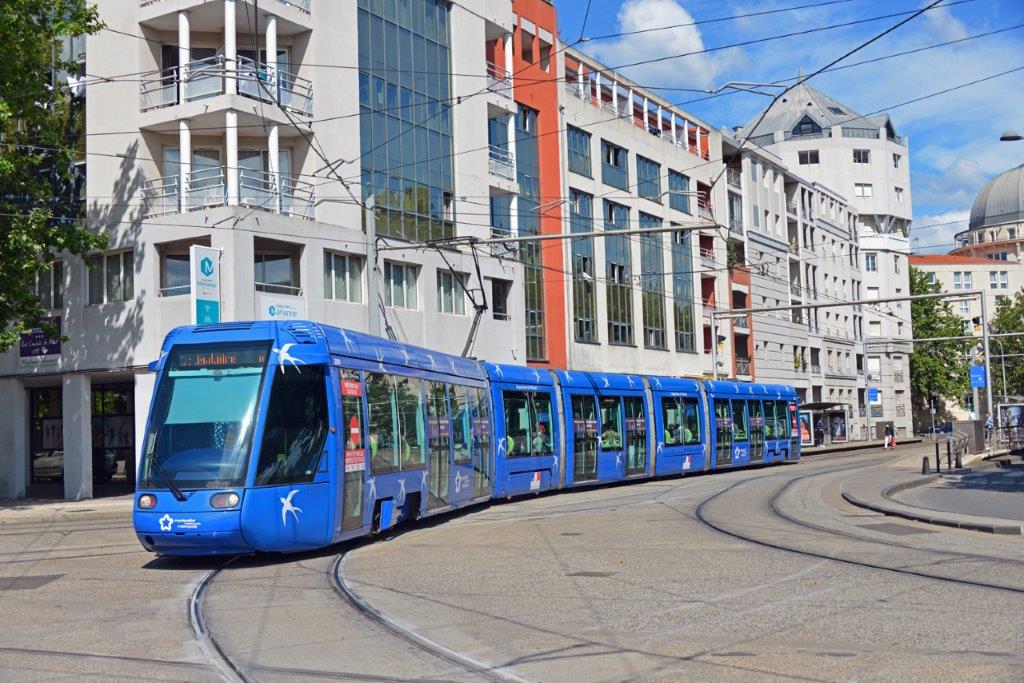 La rame 2002 Citadis 401 Alstom, opérant sur la ligne 1 en direction du terminus « Odysseum », est photographiée au moment où elle quitte la station « Moularès (Hôtel de Ville) », le mardi 9 juin 2020. Copyright : Thierry Leleu