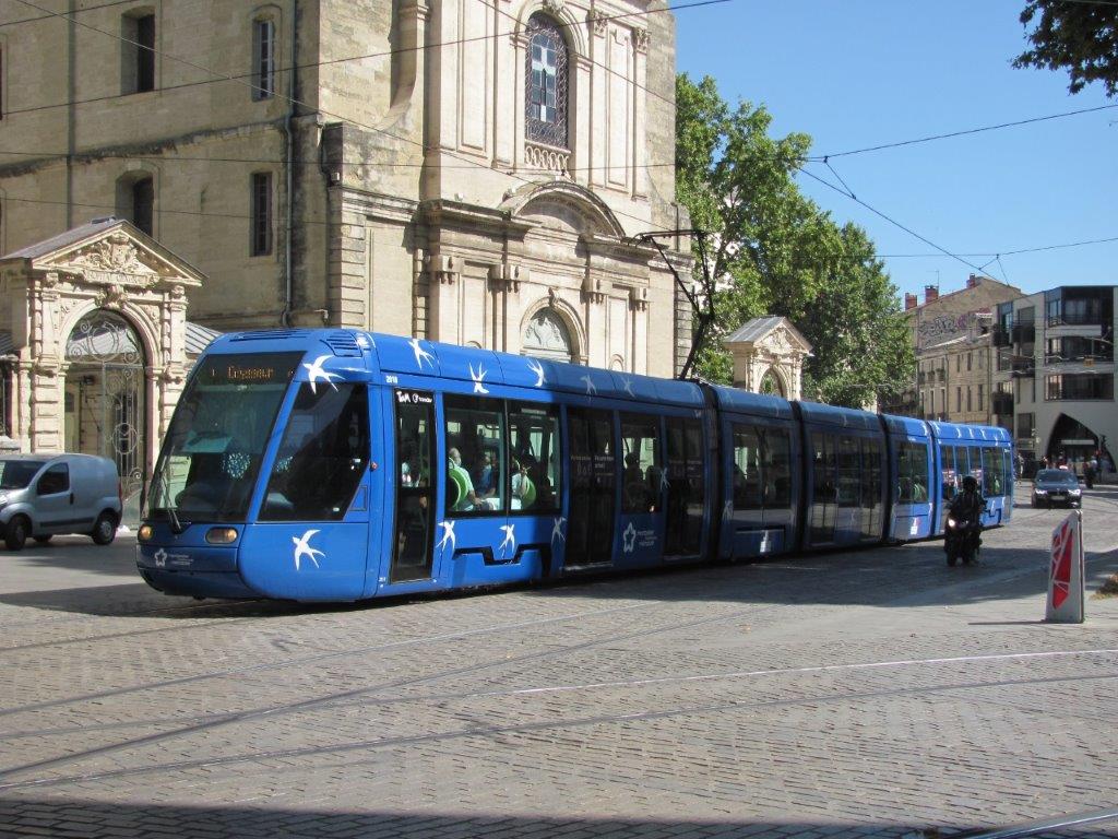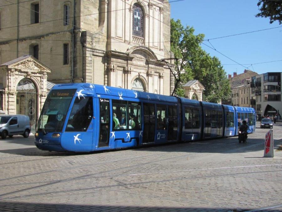 La rame 2018 Citadis 401 Alstom, opérant sur la ligne 1 en direction du terminus « Odysseum », est photographiée place Albert-1er à Montpellier, entre les stations « Place Albert 1er – Saint-Charles » et « Albert 1er – Cathédrale », le jeudi 9 juillet 2020. Copyright : Edouard Paris