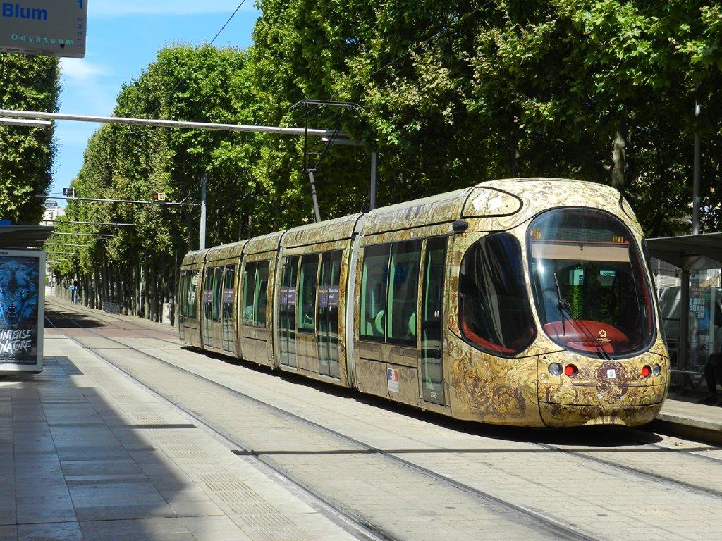 Du samedi 4 juillet au dimanche 30 août 2020, les rames opérant sur la ligne 4 desservent les stations « Du Guesclin », « Antigone » et « Léon Blum » propres à la ligne 1. Photo de la rame 2032 Citadis 302 Alstom prise à la station « Léon Blum », le samedi 4 juillet 2020, à proximité de laquelle se trouve l’arrêt d’une ligne de bus baptisée « Navette 4 » reliant « Léon Blum » à « Corum » via « Pompignane » et « Les Aubes », du samedi 4 juillet au dimanche 30 août 2020. Copyright : Anje34