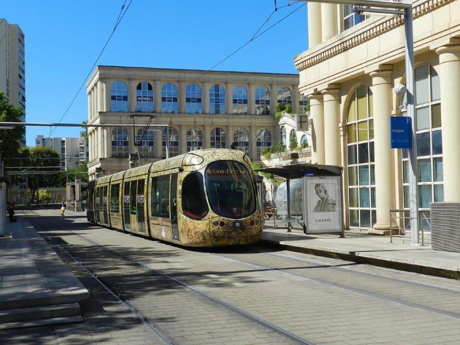 Du samedi 4 juillet au dimanche 30 août 2020, les rames opérant sur la ligne 4 desservent les stations « Du Guesclin », « Antigone » et « Léon Blum » propres à la ligne 1. La rame 2032 Citadis 302 Alstom circulant dans le sens 4b est photographiée à la station « Antigone », le samedi 4 juillet 2020. Copyright : Anje34