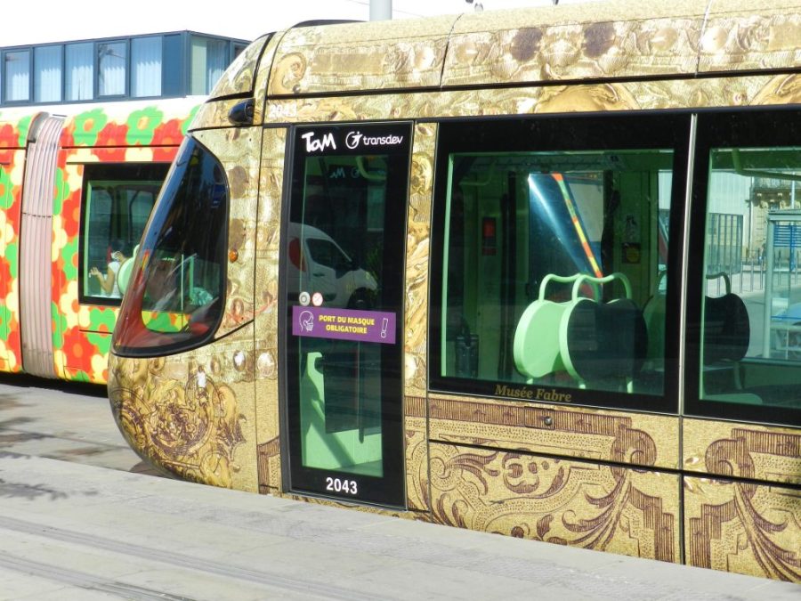 Nouvelle signalétique « Port du masque obligatoire » appliquée sur la porte vitrée à un vantail d’une rame Citadis 302 Alstom opérant sur la ligne 4, ici la rame 2043 dont la motrice de queue est photographiée à la station de secours « Gare Saint-Roch », rue Jules-Ferry à Montpellier, le jeudi 23 juillet 2020. Copyright : Anje34