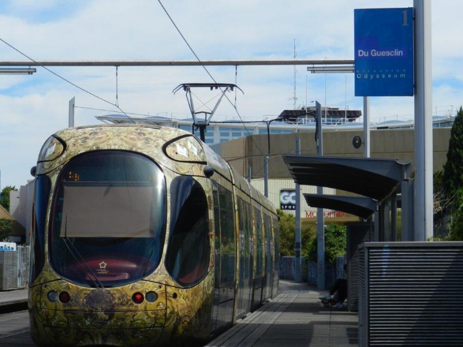 Du samedi 4 juillet au dimanche 30 août 2020, les rames opérant sur la ligne 4 desservent les stations « Du Guesclin », « Antigone » et « Léon Blum » propres à la ligne 1. La rame 2043 Citadis 302 Alstom circulant dans le sens 4a est photographiée à la station « Du Guesclin », le samedi 4 juillet 2020. Copyright : Anje34