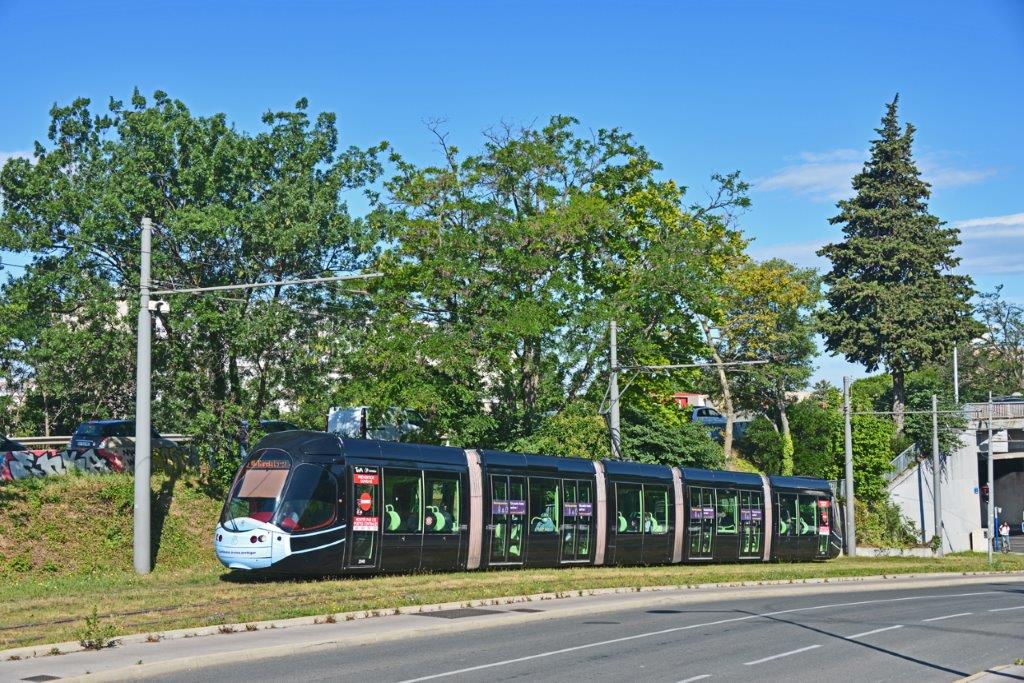 La rame 2049 Citadis 302 Alstom multiligne dont chaque motrice arbore la reproduction d’un masque chirurgical, opérant sur la ligne 4 dans le sens b, est photographiée rue des Payroliers à Montpellier, le mardi 9 juin 2020. Copyright : Thierry Leleu