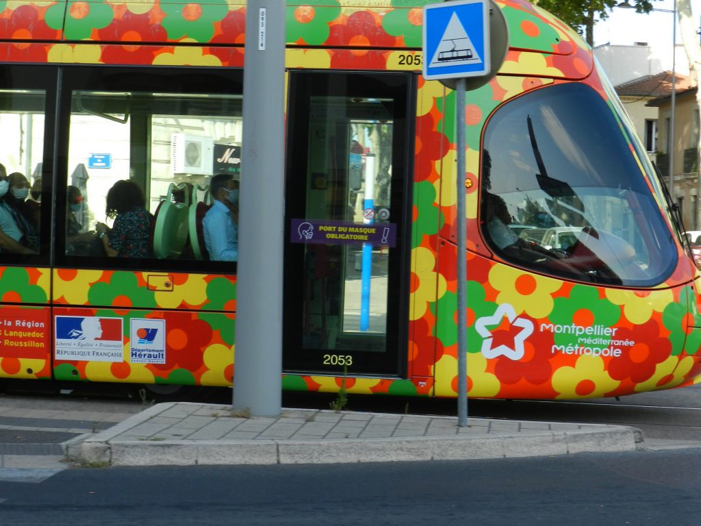 Nouvelle signalétique « Port du masque obligatoire » appliquée sur la porte vitrée à un vantail d’une rame Citadis 302 Alstom opérant sur la ligne 2, ici la rame 2053 dont la motrice de tête est photographiée au moment où elle quitte la station « Nouveau Saint-Roch » en direction du centre-ville de Montpellier, le jeudi 23 juillet 2020. Copyright : Anje34