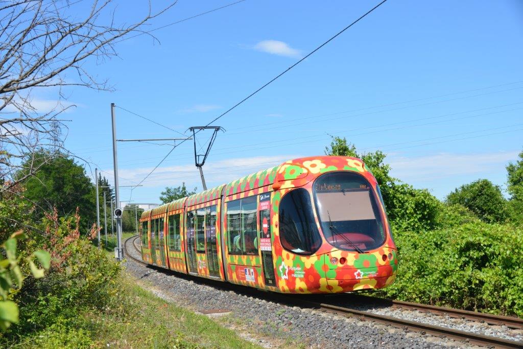 La rame 2056 Citadis 302 Alstom, opérant sur la ligne 2 en direction du terminus »Jacou », est photographiée sur la voie unique à double sens à l’approche de la station « La Condamine » située sur le territoire de la commune de Saint-Jean-de-Védas, le mercredi 10 juin 2020. Copyright : Thierry Leleu
