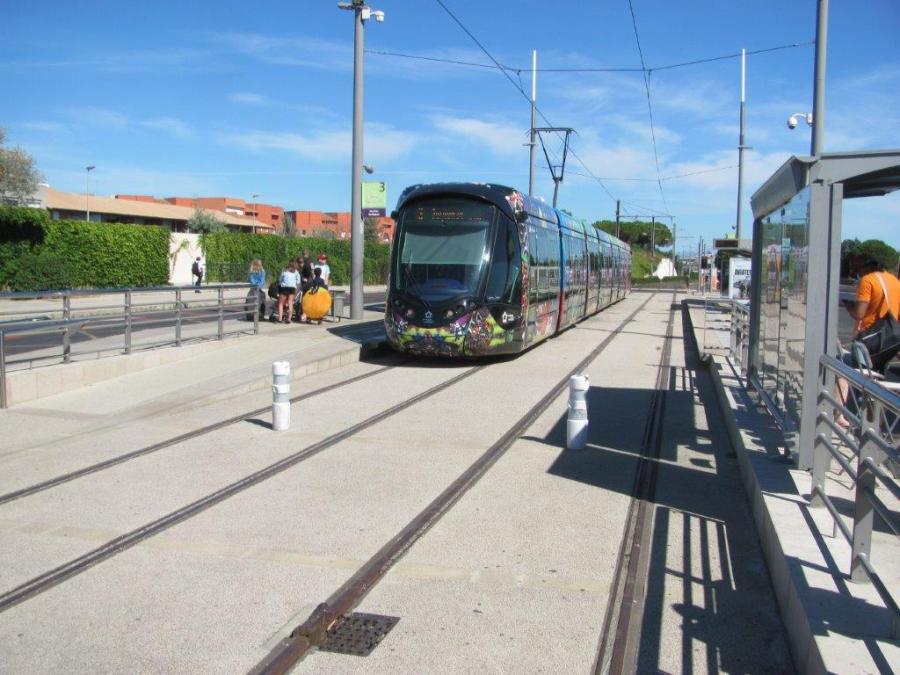 Les rames opérant sur la ligne 3, comme ici la 2074 Citadis 402 Alstom, sont en correspondance avec la navette des plages de la ligne 633 liO Hérault Transport au terminus « Pérols – Etang de l’Or », quotidiennement jusqu’au dimanche 30 août 2020. Photo prise le samedi 4 juillet 2020. Copyright : Edouard Paris