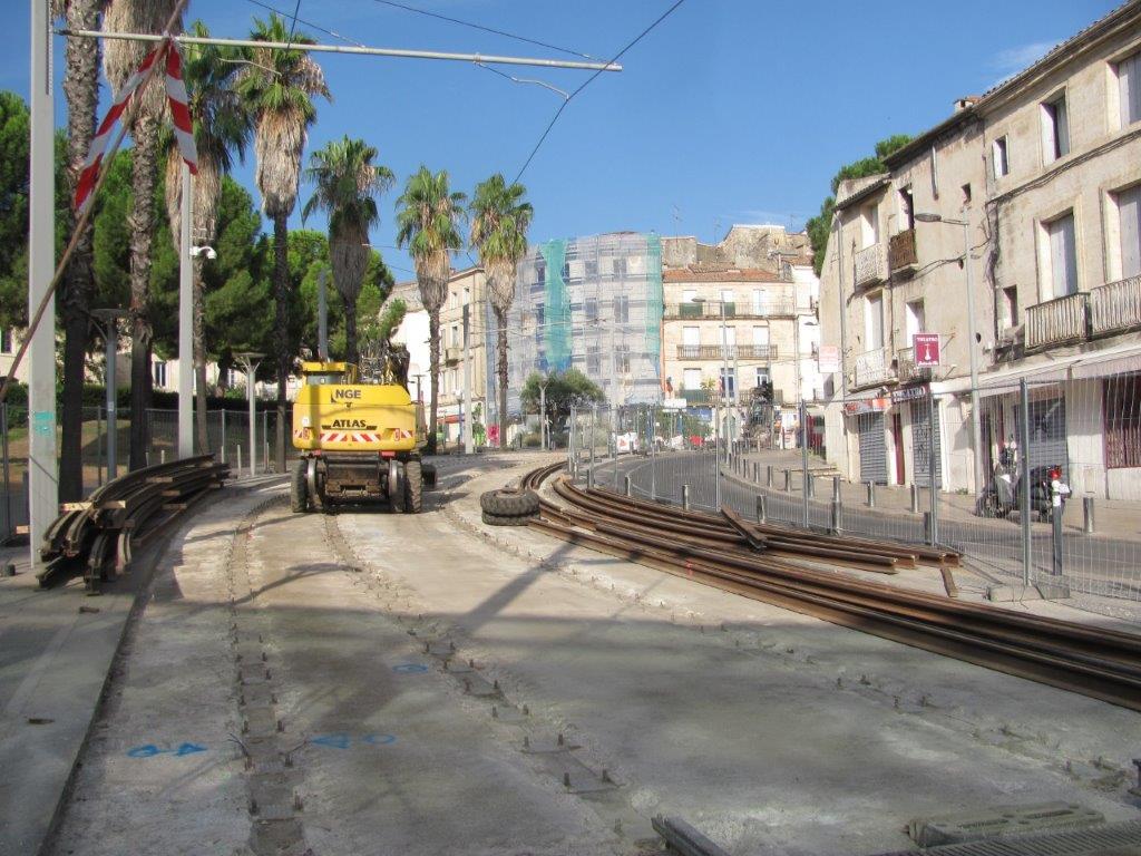 Rue du Faubourg-de-Nîmes à Montpellier, les nouveaux rails à gorge sont stockés de part et d’autre des voies 1 et 2 communes aux lignes 1 et 4 de tramway. Un engin de chantier rail-route est garé sur la plateforme. Photo prise le dimanche 2 août 2020. Copyright : Edouard Paris