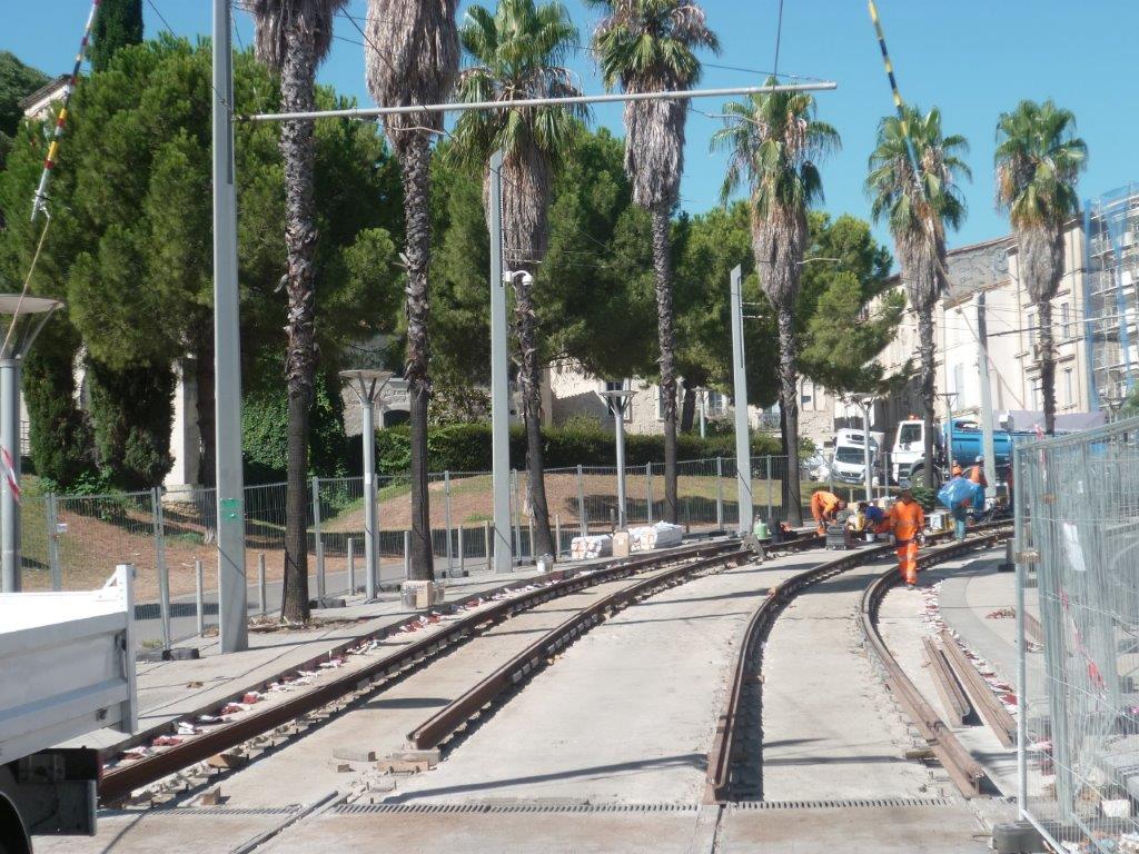 Photographie des nouveaux rails à gorge posés sur voies 1 et 2 du tronc commun des lignes 1 et 4 de tramway et d’une équipe de soudeurs, rue du Faubourg-de-Nîmes à Montpellier, le jeudi 6 août 2020. Copyright : Edouard Paris